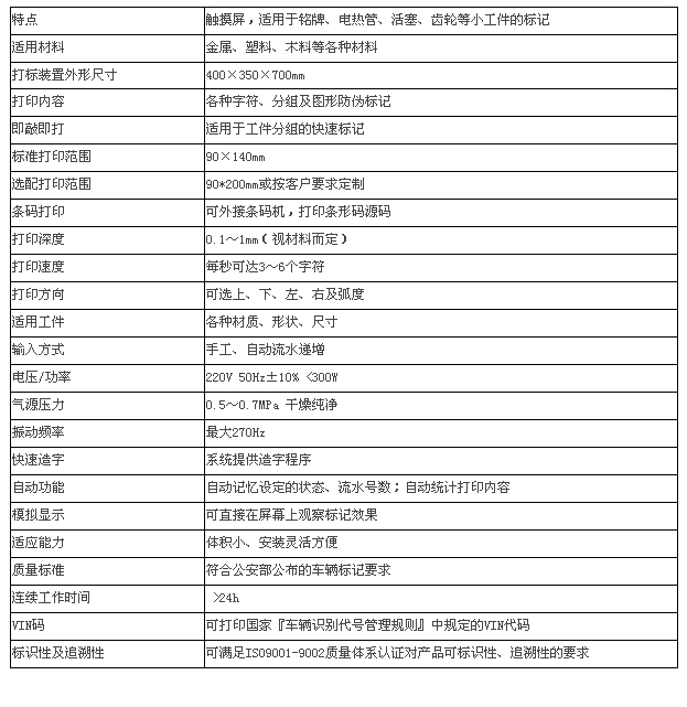 計算機控制打印針在X、Y二維平面和X、Y、Z三維立體面內(nèi),按—定軌跡運動的同時,打印針在壓縮空氣作用下做高頻沖擊運動,從而在工件表面上打標。
